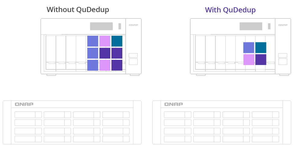 HBS выполняет полное резервное копирование и восстановление данных; QuDedup дедуплицирует данные в источнике, чтобы уменьшить использование дискового пространства и полосы пропускания, а также время резервного копирования.