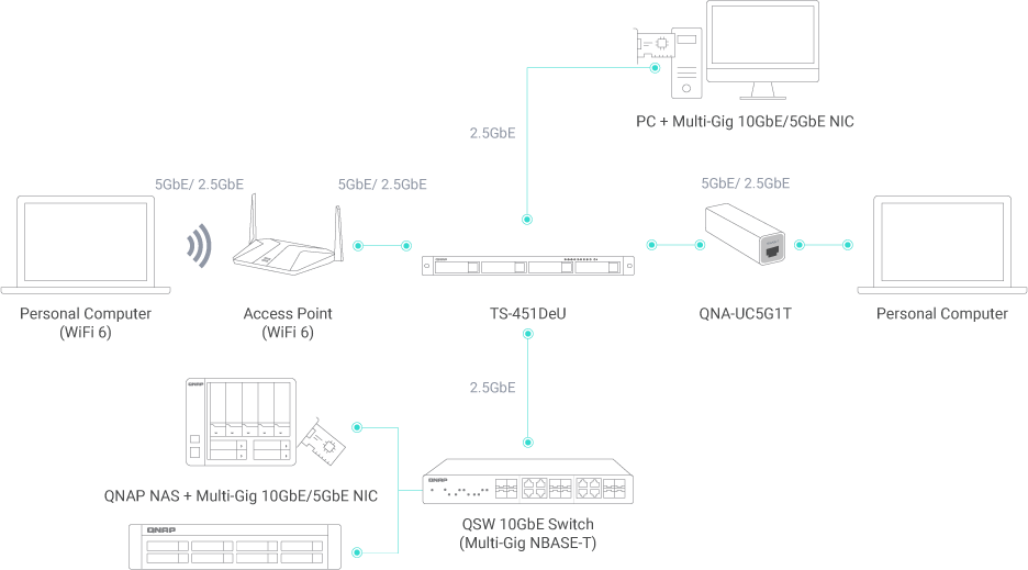 Обновите сетевую инфраструктуру и перейдите на новый стандарт Wi-Fi 6 вместе с QNAP. Сетевой накопитель TS-451DeU уже оснащен двумя портами 2,5 Гбит/c, а в существующий парк компьютеров, ноутбуков и серверов установите сетевые адаптеры с поддержкой 5 или 10 Гбит/c, при этом в построении сети помогут коммутаторы серии QSW. При необходимости беспроводных соединений используйте беспроводные адаптеры QNAP.