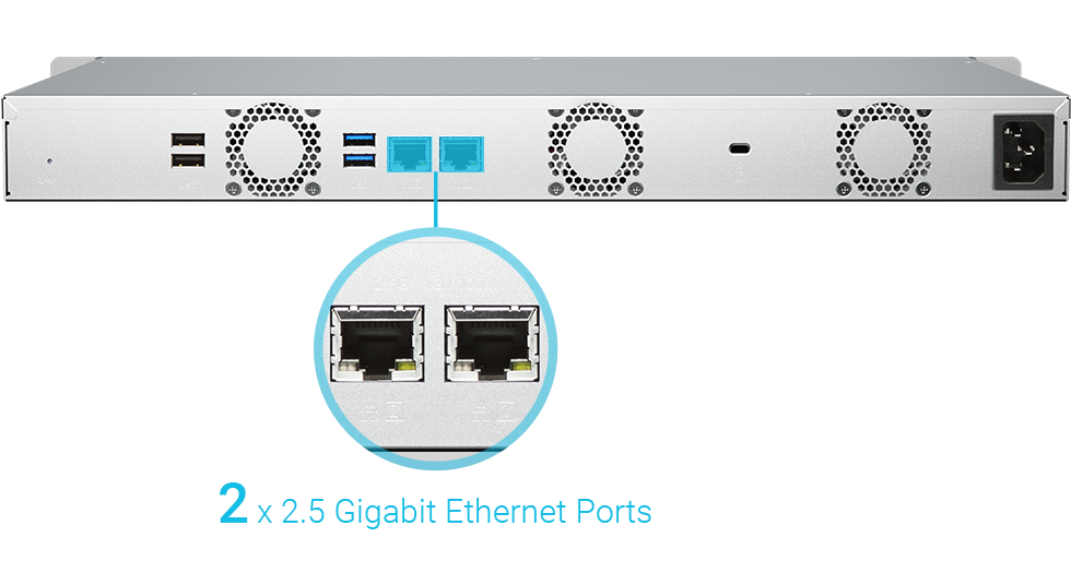 Общая тенденция перехода к новому поколению беспроводных сетей Wi-Fi 6 (802.11ax) привела к увеличению требований к пропускной способности и проводных подключений. TS-451DeU поставляется с двумя LAN портами RJ-45, которые подходят под существующие кабели CAT5e, но повышают скорость сети с 1 Гбит/c до 2,5 Гбит/c.