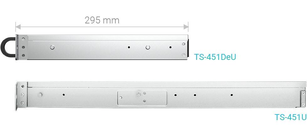 По сравнению с обычными четырехдисковыми NAS модель TS-451DeU имеет глубину всего 291 мм, что делает ее отличным выбором для малогабаритных серверных шкафов, а в случае использования стандартных монтажных стоек свободное пространство пригодится для прокладки кабелей или дополнительной вентиляции.